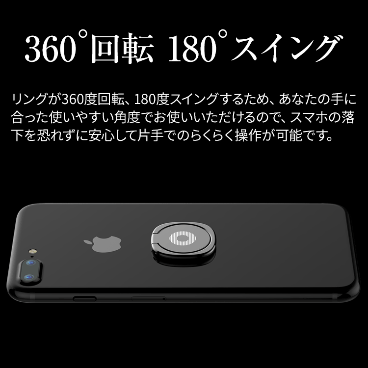 360°回転 180°スイング リングが360度回転、180度スイングするため、あなたの手に合った使いやすい角度でお使いいただけるので、スマホの落下を恐れずに安心して片手でのらくらく操作が可能です。
